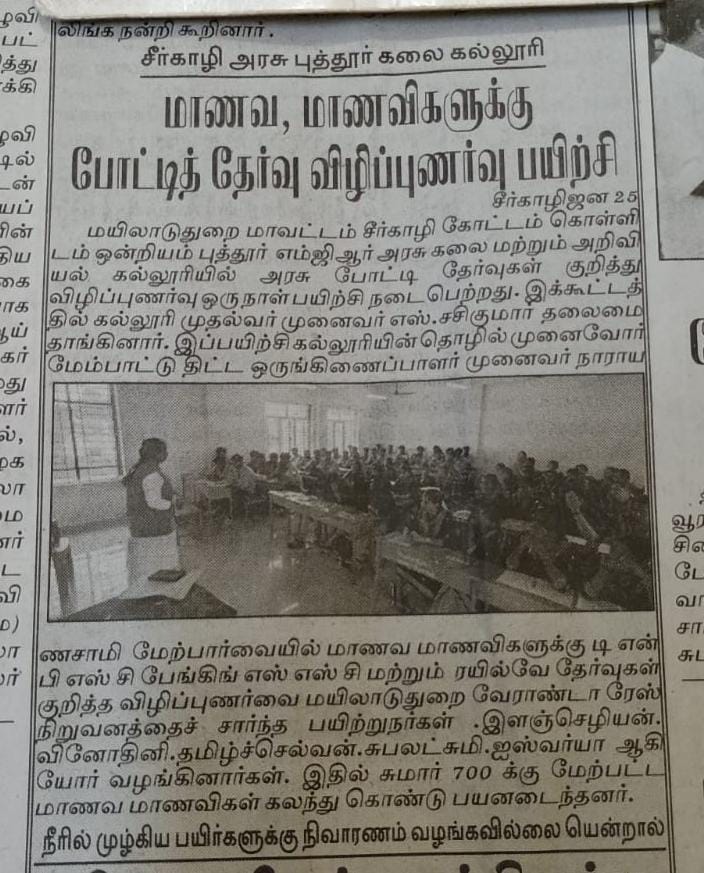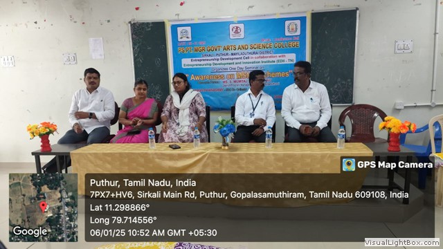 On 06-01-2025 an awareness program on “AWARENESS ON MSME SCHEMES” was conducted at PS.PT MGR Government Arts and Science College, Puthur, Sirkali. This programme was organized by College Entrepreneurship Development Cell joint with Entrepreneurship Development and Innovation Institute (EDII-TN). The EDP Cell co-ordinator Dr.M.Thirunarayanasamy, Associate Professor, Department of Commerce was welcomed the gathering. Our principal (i/c) Dr.S.Sasikumar was rendered presidential address. The chief guest Ms.S.MUMTAJ SIMRIN BANU, District program Manager, EDII- TN Mayiladuthurai was created awareness on MSME schemes available for Entrepreneurs Development. The chief quest was honoured by Dr. G.S. Jayesh, Assistant Professor, Department of Business Administration and Dr. G. Mageswary, Assistant Professor, Department of Computer Science. 154 students was attended and benefited, they interacted with the resource person and clarified their doubts. Dr.G. Mageswary proposed the vote of thanks. The programme successfully comes to end.